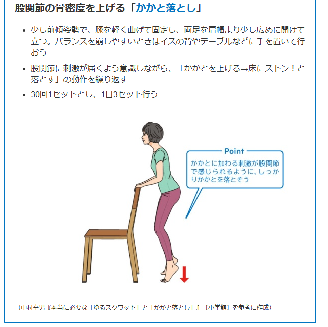 中村幸男先生が考案した「かかと落とし」は、脚のつけ根である股関節、特に大腿骨部や臼蓋部に衝撃を与える運動で、スクレロスチンの分泌を抑え、この運動を継続することによって、脚の骨全体、特に股関節を強化することができます。結果的に骨密度がアップし骨の強度も増加します。さらに、かかと落としは、脚全体の筋力アップにも効果があります。我々は、かかと落としを毎日“正しく”(膝を軽く曲げる、前傾姿勢をとる)きちんと行うことにより、長野県内の大腿骨の骨折発生数が減少傾向にあるというデータを出しています。1日30回×3セットを目標に取り組んでみましょう。